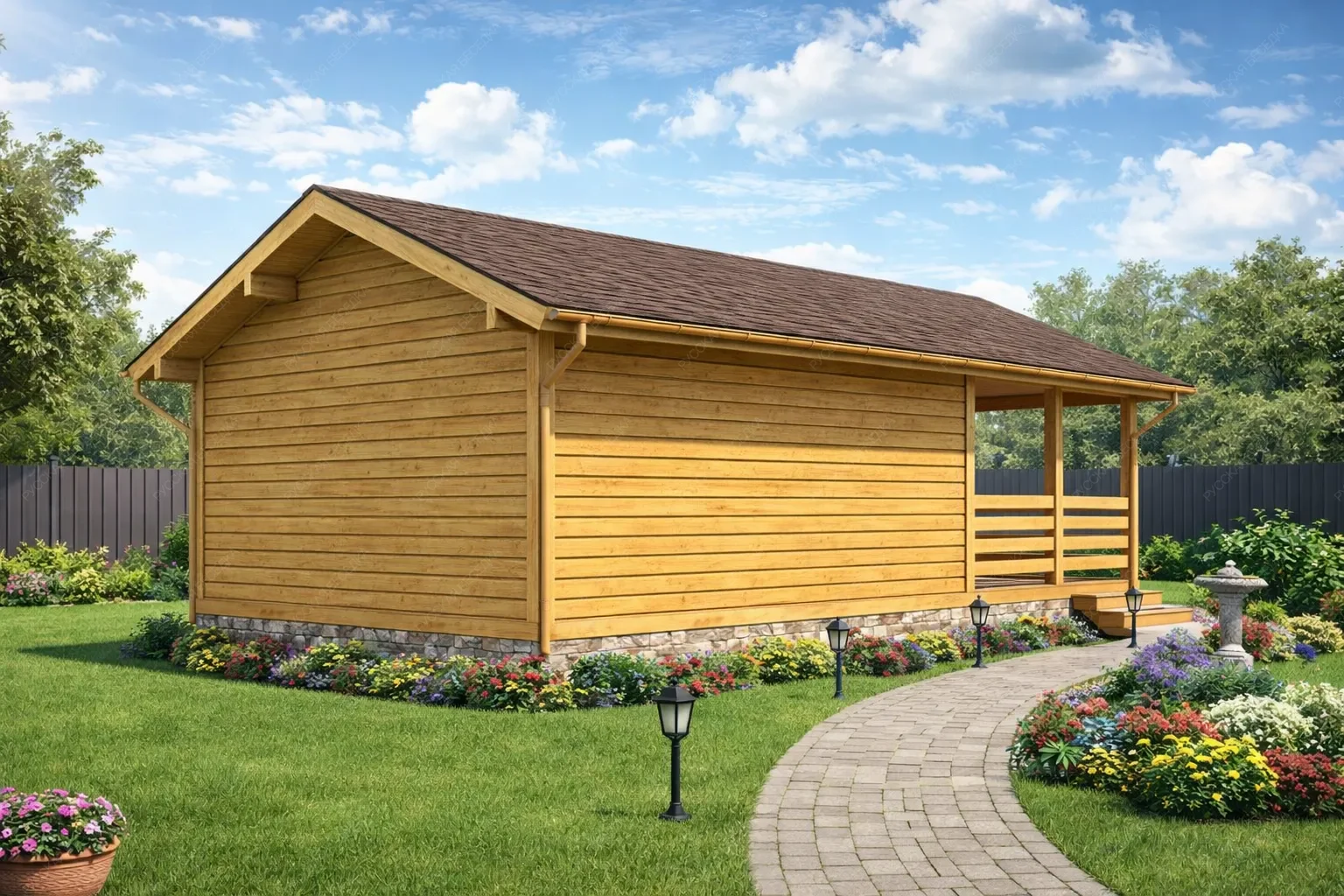 Квадратная баня «Ладань» размером 6х6 метров представляет собой классическую и компактную планировку общей площадью 36 кв.м. под двухскатной крышей. Каркасная технология обеспечивает оптимальное соотношение стоимости, скорости возведения и теплоэффективности. Внутреннее пространство организовано с особым вниманием к функциональности и комфорту процедур. Отличительной чертой модели является четкое и удобное зонирование: отдельная парная 5.57 кв.м., просторная душевая 5.50 кв.м. и изолированный санузел 0.90 кв.м. Центральным местом отдыха выступает комната площадью 17.78 кв.м., что для строения таких габаритов является значительным преимуществом. Наличие крыльца (террасы) формирует буферную зону и придает проекту законченный вид. Данная конфигурация идеально подходит для стандартного участка и рассчитана на одновременное посещение небольшой семьей или компанией друзей, предлагая все необходимое для полноценного банного ритуала без излишеств.