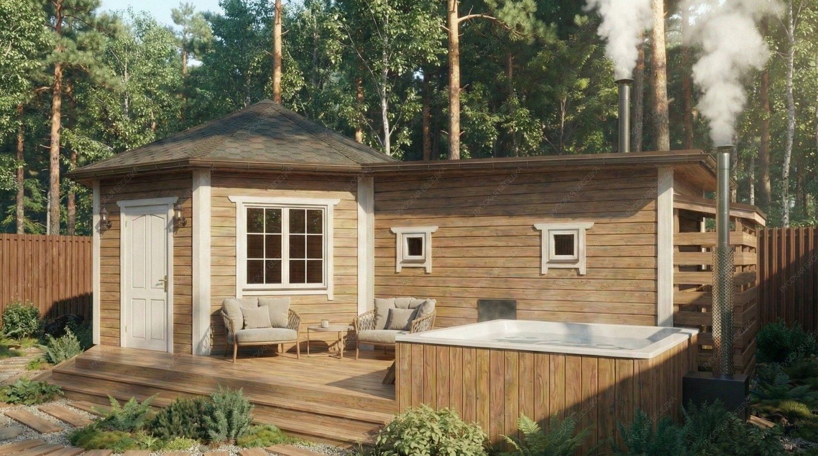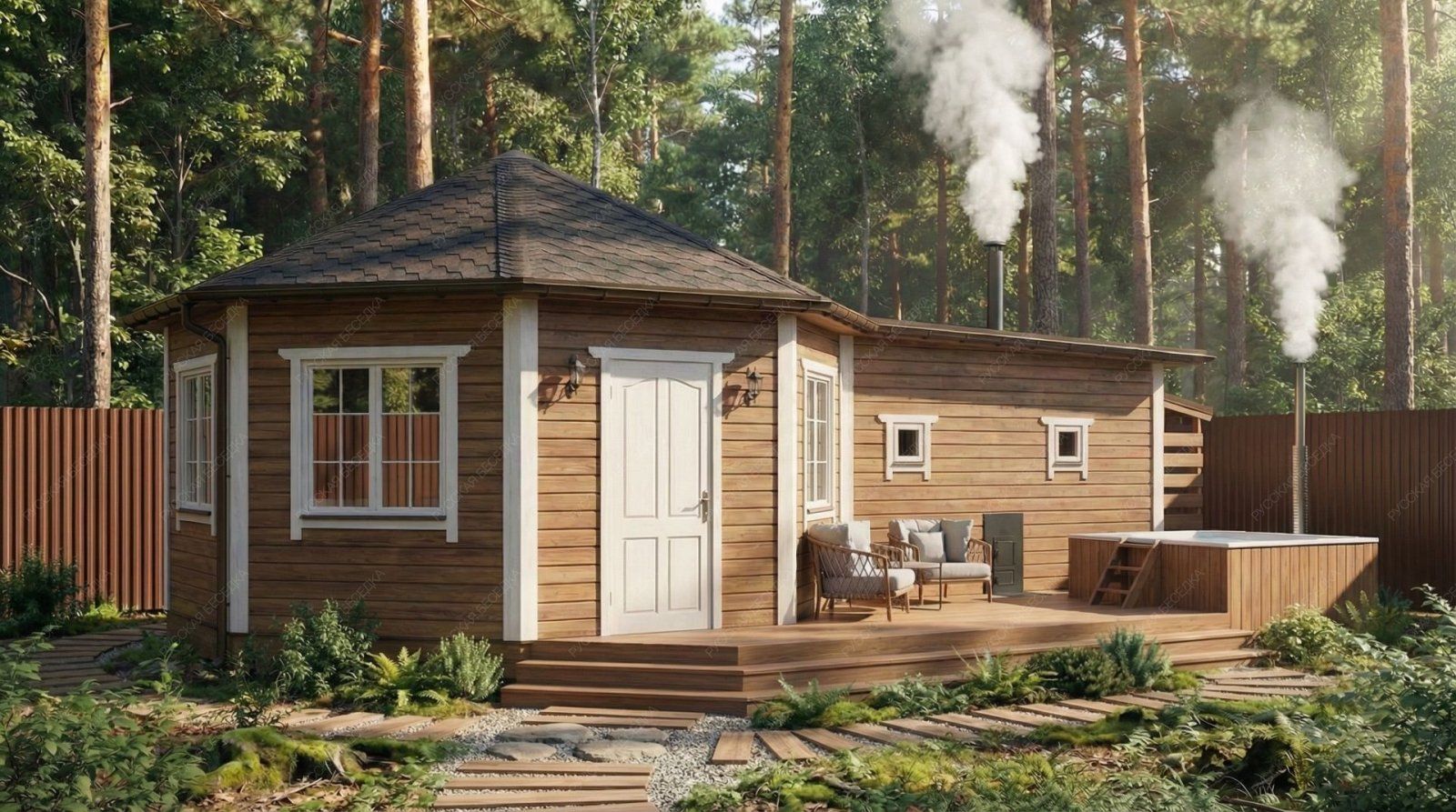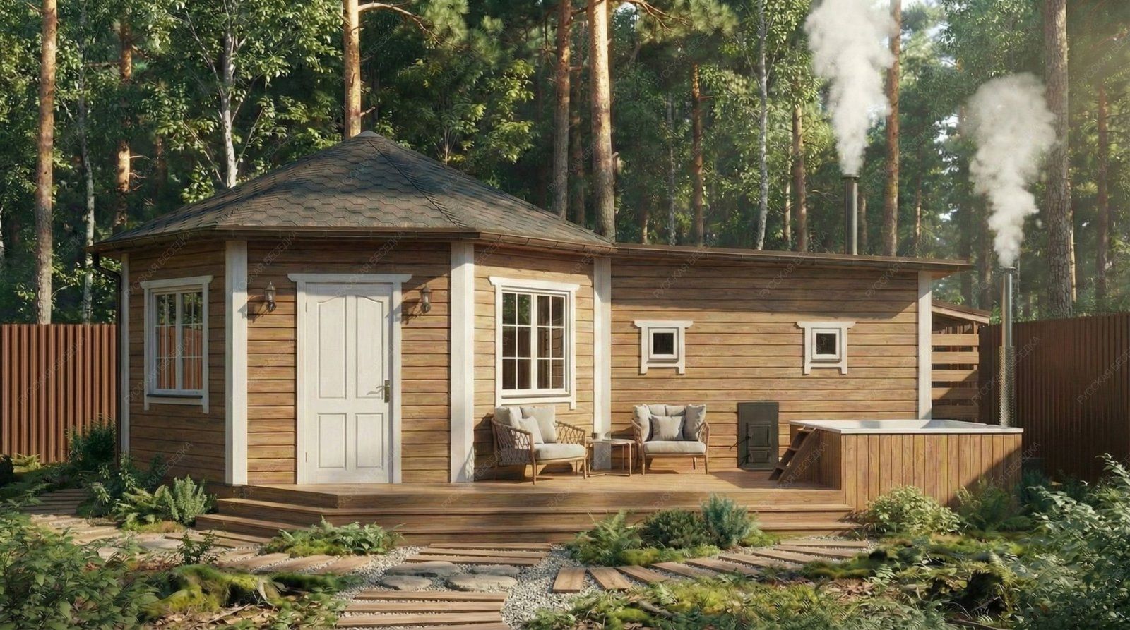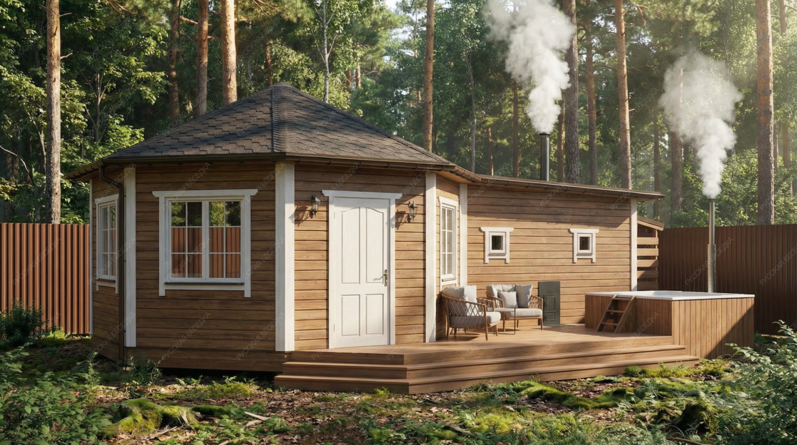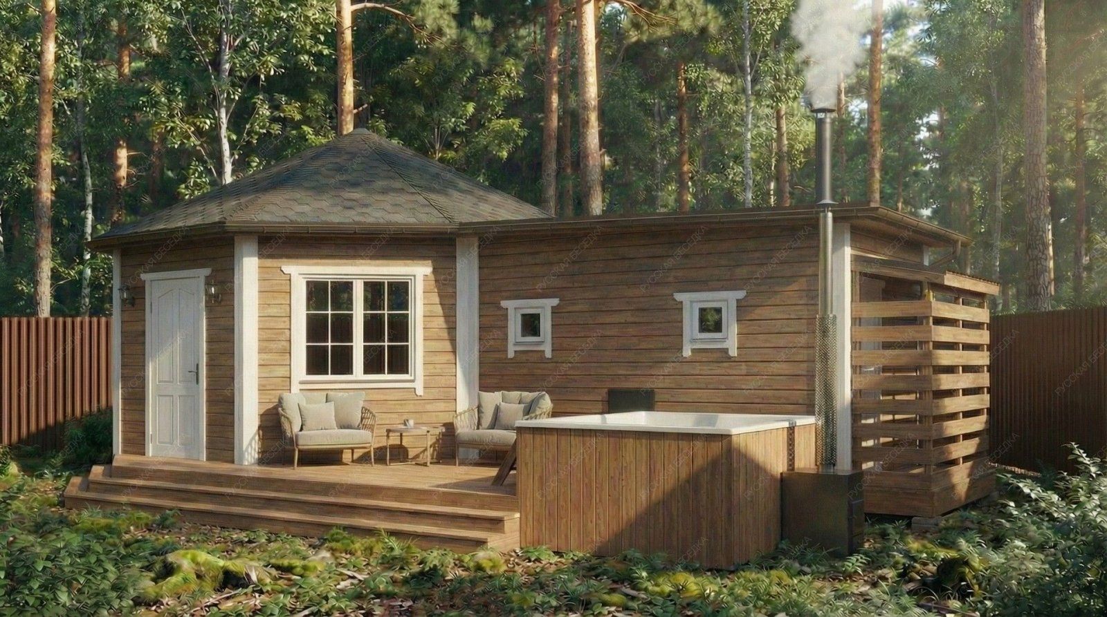 Баня «Терция» предлагает уникальное архитектурное решение, центральным элементом которого является просторная восьмигранная комната отдыха площадью 21,46 м². Такая форма создает особую, уютную атмосферу для общения и релаксации, делая интерьер запоминающимся и визуально выразительным.  Функциональные зоны тщательно продуманы. Парная (4,7 м²) оснащена двумя окнами-форточками, что обеспечивает превосходный контроль за паром и вентиляцией. Отдельная помывочная комната поддерживает чистоту и удобство. Открытая терраса площадью 12,13 м² логично дополняет комплекс, предусматривая специальное место для установки купели, что создает идеальные условия для контрастных процедур.  Классическая восьмискатная крыша и солидные габариты основного строения (5,5х9,7 м) формируют представительный внешний облик. Качественное исполнение из отборной древесины гарантирует долговечность, эффективное сохранение тепла и создание той целебной микросреды, которая является сутью настоящей русской бани. Этот проект идеально подходит для тех, кто ценит не только функциональность, но и оригинальность архитектурных форм в организации пространства для отдыха.