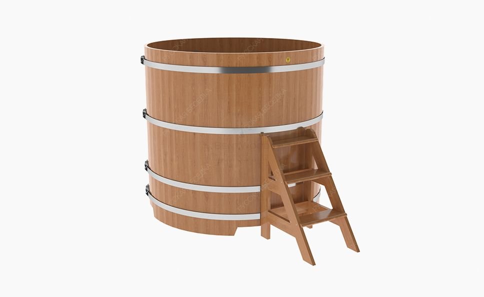 Купель круглая из дуба d=1,50 Изготовлена из дуба, имеет размер - в диаметре - 1,50 метра, высота - 1,4 метр. Поверхность купели обработана специальным, особым защитным покрытием из полиуретана – придающий поверхности купели – водостойкость – износостойкость, обладающим эластичностью. На ощупь – поверхность купели имеет приятную гладкую текстуру. Такая защита является абсолютно экологически безопасной что подтверждено государственным гигиеническим сертификатом. В случае, когда купель нужно установить на открытом воздухе – поверхность купели обрабатывае тся специальным покрытием с защитой от ультрафиолетовых лучей. В некоторых случаях, например - когда габариты купели превышают размеры дверных проемов в помещениях, доставка купели осуществляется в разобранном виде –в составе из четырех отдельных сегментов и донышка, сборка осуществляется на месте - стоимость сборки купели - уточняйте у менеджеров.