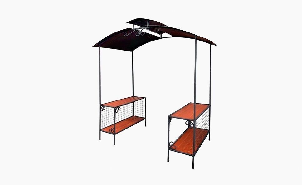 Мобильный навес для мангала и гриля с тройной закругленной крышей. Возможно расположение на дачном участке вне зависимости от наличия специальной площадки или фундамента. Навес устанавливается просто на газон или любую ровную поверхность.  Изделие имеет в своей конструкции четыре широких деревянных столика, покрытых специальным атмосферостойким покрытием. Они позволят Вам разместить кухонную утварь: казаны, кастрюли, шампуры и щипцы. Вы также можете использовать их как дровницы. Под широкой крышей этого красавца Вы можете расположить не только свой любимый гриль или тандыр, но и дрова а также стол для разделки и нарезки.  Навес ММ27.1 всегда спрячет Вас от непогоды-дождя и снега и даст возможность готовить Ваши любимые блюда на углях в любое время года.