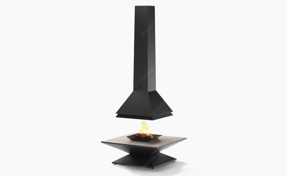Яркий представитель каминного стиля хай-тек. Этот островной камин отлично дополнит и украсит интерьер Вашего дома. Преимущество данной модели камина состоит в том, что он может быть использован в нескольких вариантах: -как открытый очаг с возможностью наблюдать красивейшую игру пламени вживую, и создании романтической обстановки для теплого вечера -и как камин с закрытой топкой при установке защитных огнеупорных стекол, что удобно в случае, если в доме бывают дети и собираются большие компании. Защитные стекла могут быть просто приставными, а могут фиксироваться магнитами. Управление магнитными фиксаторами может осуществляться  с дистанционного пульта. Камин прост в обслуживании, не требует к себе особого технического внимания. Технические параметры: Центральный (островной) камин Ширина столешницы — 122 см Ширина и длина дымосборника — 82 см Высота тумбы — 44 см Стенка дымохода — 27 см  Общая высота  — 360 см (индивидуальный параметр) Вид топлива — Дрова Сталь—конструкционная, котловая сталь, толщина стали в термонагруженных участках 10 мм Покрытие - немецкая термостойкая краска, рассчитанная на температуру нагрева более 1000 С Материал столешницы в базовом варианте мрамор Crema Marfil, возможен вариант с другим камнем Жаростойкое и ударопрочное стекло толщиной 6 мм, выдерживающее длительные температурные нагрузки Регулировка положения основания камина