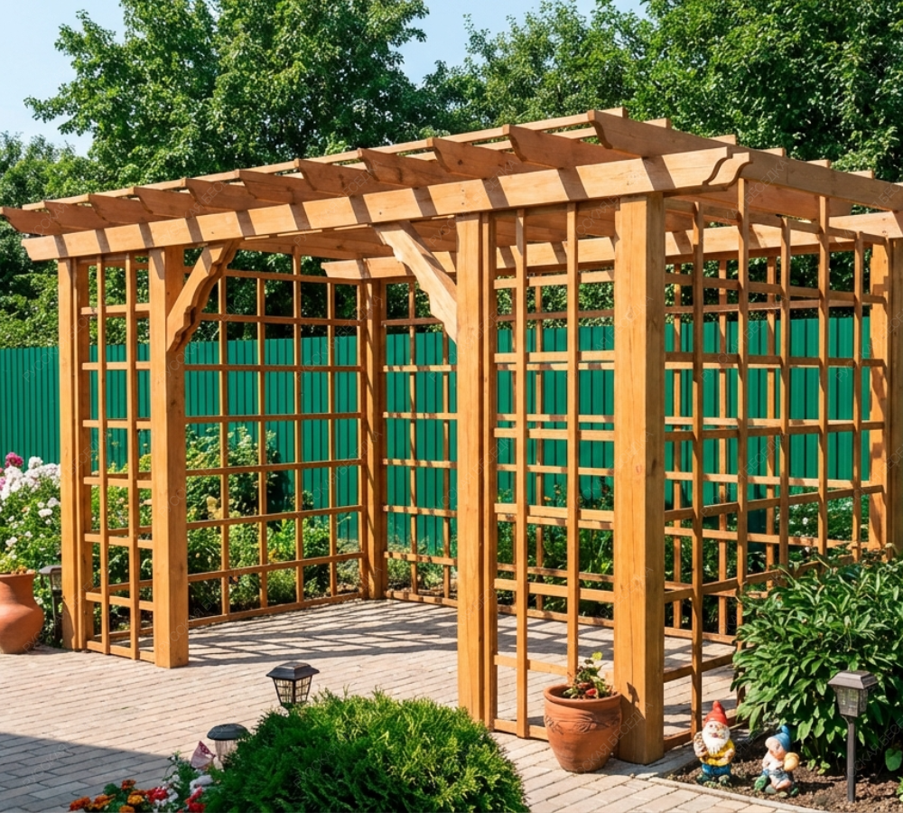 Перголы из дерева сочетают в себе природную красоту и современные дизайнерские решения, создают идеальное место для отдыха и различных видов досуга на открытом воздухе. Перголы могут стоять отдельно или быть частью композиции с другими элементами сада.