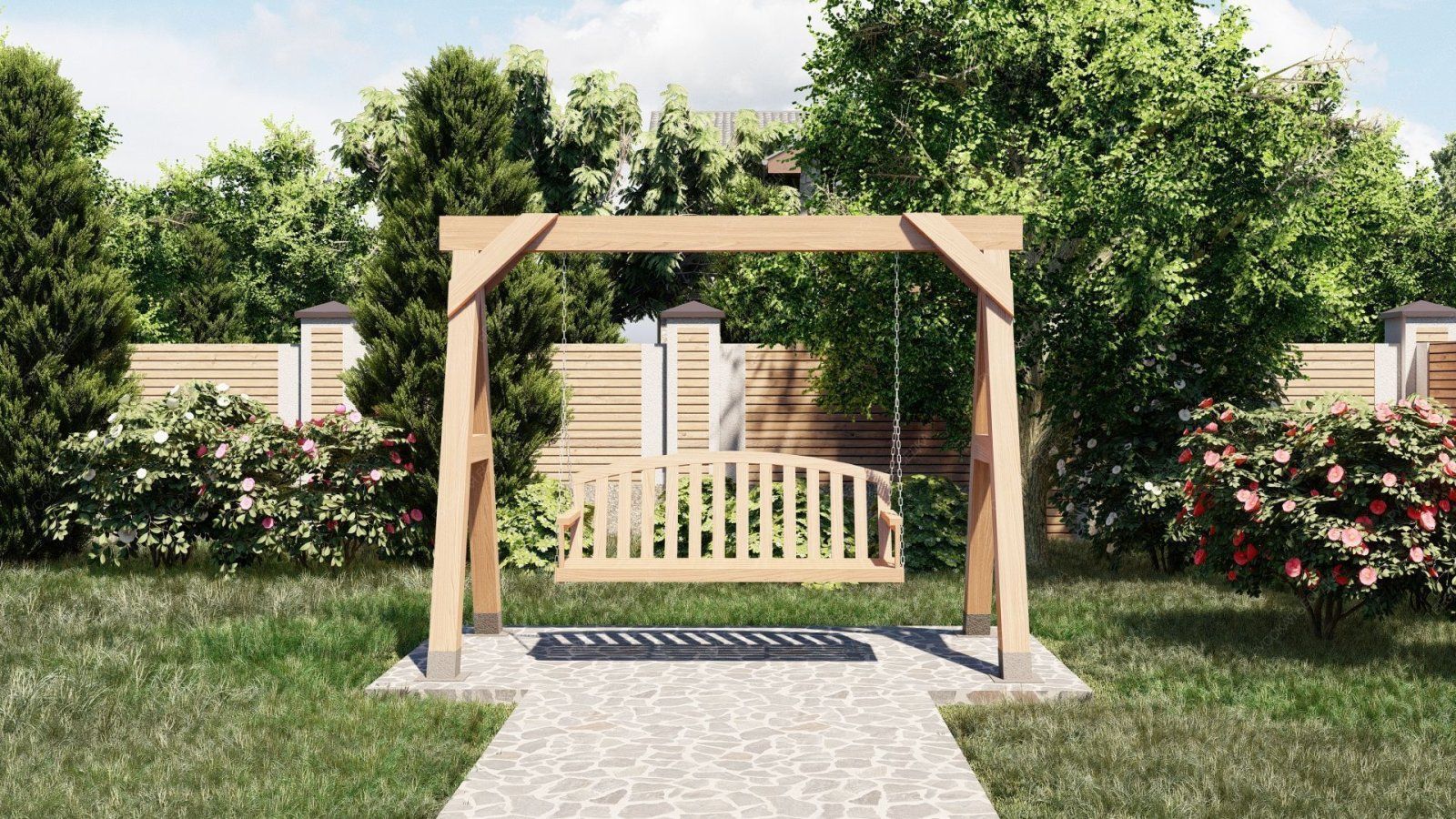 Эти качели идеально вписываются в ландшафт вашего участка, добавляя ему стильный и современный акцент. Они станут любимым местом для всей семьи, где можно провести время в общении и отдыхе.